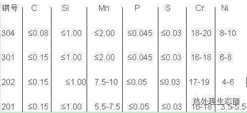 其特性也是不同的,为了加以区别则冠上了不同的钢号,下面是常见装饰用不锈钢不同钢号“合金元素”含量表仅供参考: